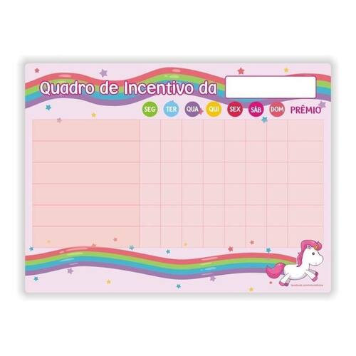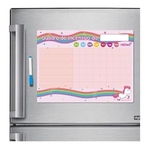Os Nossos Imãs para geladeira são impressos com tinta Eco-Solventes com qualidade fotográfica em Vinil Autocolante e depois fixado em uma Manta Magnética com 0,8 mm espessura, ideias para serem fixados em geladeiras. São ideais para quem quer fazer mudanças no ambiente da cozinha de sua casa sem gastar muito, além do seu preço acessível dispensa a contratação de profissionais, já que você mesmo a pode fazer a instalação. Painel Magnético Quadro de Tarefas. Medida do painel: 40 cm x 30 cm. O painel magnético colorido é perfeito para recompensar o bom comportamento das crianças em casa, creches ou escolas. Como utilizar: 1- Relacione as tarefas; 2- Marque se as mesmas foram concluídas ou não; 3- Defina o nº de pontos e a recompensa por semana. acompanha uma caneta azul com imã e apagador + recarga azul Recomendações: - Faça a limpeza periódica do seu quadro de tarefas com removedor. Marca: Não Informado Ean: 7898667233625