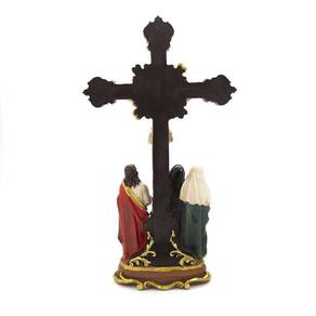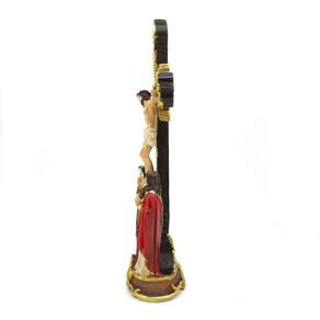 Imagem Cristo Crucificado Com Maria, Maria Madalena e São João Resina 30 cm Cristo Crucificado: A representação de Cristo crucificado com Maria, Maria Madalena e São João é uma cena comum na arte religiosa cristã, especificamente na representação da crucificação de Jesus. Essa composição é baseada nas narrativas bíblicas dos Evangelhos, onde Maria, a mãe de Jesus, Maria Madalena e o apóstolo João estavam presentes no momento da crucificação. Maria, como mãe de Jesus, está frequentemente representada ao pé da cruz, simbolizando sua dor e sofrimento ao testemunhar a morte de seu filho. Maria Madalena, uma discípula de Jesus, também é frequentemente retratada próxima à cruz, representando seu amor e devoção a Jesus. São João, por sua vez, é considerado o apóstolo amado de Jesus e é frequentemente representado ao lado de Maria, simbolizando sua proximidade com Jesus durante sua vida e morte. Essa representação centraliza a crucificação de Jesus como um evento de extrema importância para a fé cristã, mostrando a presença de figuras significativas que testemunharam esse momento. Além disso, essa representação também expressa a dor, o amor e a devoção dos personagens envolvidos, ressaltando a importância do sacrifício de Jesus na redenção da humanidade, de acordo com a crença cristã. Dimensões: altura: 30 cm - Largura: 16 cm - Profundidade: 6 cm Dimensões aproximadas do produto. Produto pintado a mão, podendo sofrer variações de cores. Marca: Não Informado