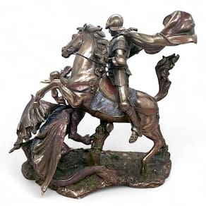 Destaques do Produto: Design realista e impactante – São Jorge montado em seu cavalo, em batalha contra o dragão. Acabamento em bronze envelhecido – visual nobre e elegante. Altura de 27 cm – tamanho ideal para decoração ou altar pessoal. Feita em resina resistente – durabilidade e riqueza nos detalhes. "São Jorge, guerreiro da luz, protegei-nos em todas as batalhas."