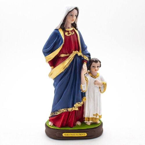 Imagem Maria Passa na Frente Resina 20 cm Maria Passa na frente e resolve aquilo que somos incapazes de resolver. Dimensões: altura: 19,5 cm - Largura: 10 cm - Profundidade: 5,5 cmDimensões aproximadas do produto.Produto pintado a mão, podendo sofrer variações de cores. Marca: Amém Decoração Religiosa
