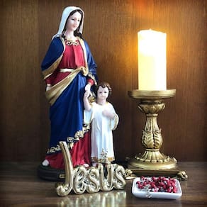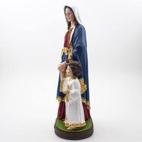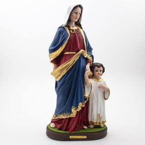 Imagem Maria Passa na Frente Resina 30 cm Maria Passa na frente e resolve aquilo que somos incapazes de resolver. Dimensões: altura: 30 cm - Largura: 14 cm - Profundidade: 9 cm Dimensões aproximadas do produto. Produto pintado a mão, podendo sofrer variações de cores. Marca: Não Informado