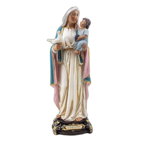 Imagem Nossa Senhora da Esperança Importada Resina 31 cm A origem do título de Nossa Senhora da Esperança é inspirada na experiência da própria Virgem Maria, que exprime a esperança de Maria em ver seu Filho Santo ao fim da gravidez. E também por parte dos fiéis que sempre tiveram esperança na Santa Mãe, que ela os ajude em suas necessidades pessoais. Chamado por esse motivo na liturgia de Esperança dos desesperados. Pedro Álvares Cabral um dos ilustres devotos de Nossa Senhora da Esperança em Portugal, tinha uma imagem da Santa e levou-a consigo em sua viagem de descoberta do Brasilque foi descoberto sob a proteção de Nossa Senhora da Esperança. em 17 de janeiro foi em 1871, o bispo da cidade de Saint Brieuc fez um voto a Nossa Senhora da Esperança, pedindo a ela que salvasse a França da invasão. Este voto foi lido em Paris, na hora da Ave Maria, às dezoito horas. Mesma hora que a Virgem Maria apareceu num local chamado Poitmain, perto das frentes inimigas. Ela foi vista, por dois irmãos, José, 10 anos e Eugênio, de 12. Os adultos não conseguiam ver Nossa Senhora. O padre foi chamado, juntamente com a professora local. Outras duas crianças que os acompanhavam, tiveram a mesma visão. E, sem que os meninos dissessem nada, essas outras crianças confirmaram o que eles diziam, afirmando estarem vendo a Virgem Maria. O padre e o povo, então, se ajoelharam e começaram a rezar. grandes milagres e graças foram alcançadas no local da aparição. Pouco tempo depois foi construída ali uma linda basílica.Festa litúrgica 26/04Dimensões: altura: 31 cm - Largura: 10 cm - Profundidade: 10 cmDimensões aproximadas do produto.Produto pintado a mão, podendo sofrer variações de cores.Nsra, sra Marca: Amém Decoração Religiosa