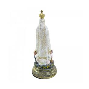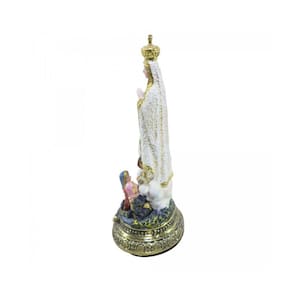 Crianças Na imagem, também é possível identificar três crianças, que são justamente, aquelas que comentamos no começo do artigo: Lucia (10 anos), Francisco (9 anos) e Jacinta (7 anos), que tiveram as graças de receberem as primeiras visões de Nossa Senhora. Em algumas representações, eles também podem aparecer como cordeiros, já que realizavam o trabalho de pastores. Marca: Taimes Imports