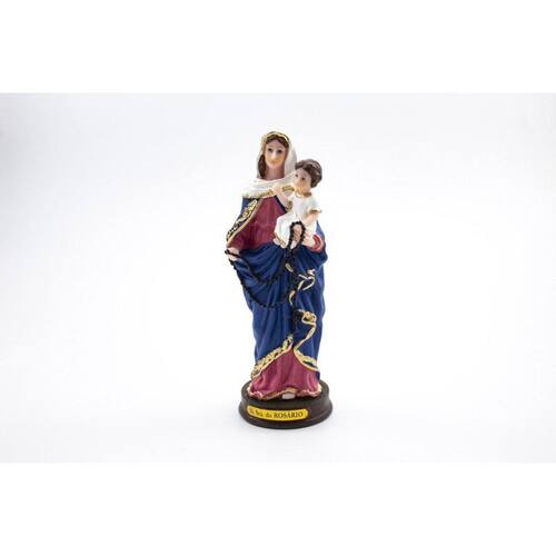 Imagem Nossa Senhora do Rosário Resina 15 cm Nossa Senhora do Rosário, é o título da aparição e Virgem Maria a São Domingos de Gusmão no mosteiro de Prouille, na qual a mãe de Jesus entregou o Santo Rosário, como potente para a conversão, ao fiel frade dominicano. Dimensões: altura: 15 cm - Largura: 6 cm - Profundidade: 5 cm Dimensões aproximadas do produto. Produto pintado a mão, podendo sofrer variações de cores. Marca: Não Informado