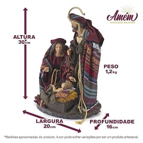 Imagem Sagrada Família Tecido Colorido Importada Resina 30 cm A sagrada Família é imagem modelo de toda a família humana. Exemplo de respeito, amor e união. Dimensões: altura: 30 cm - Largura: 20 cm - Profundidade: 16 cm Dimensões aproximadas do produto. Produto pintado a mão, podendo sofrer variações de cores. Familia Marca: Amém Decoração Religiosa Marca: Amém Decoração Religiosa
