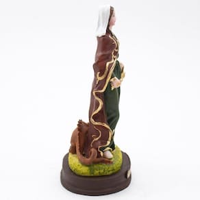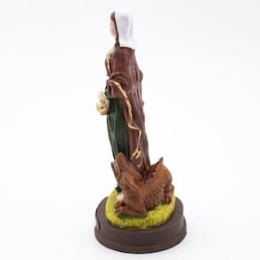 Imagem Santa Marta Resina 14 cm Santa Marta, padroeira dos anfitriões, hoteleiros, nutricionistas, cozinheiros e nutrólogos. Era irmã de Lázaro, grande amigo de Jesus e de Maria, aquela que se sentava aos pés do Mestre para ouvi-lo. Sua familia vivia no vilarejo de Betânia, a três quilômetros de Jerusalém. Sua casa era um verdadeiro local de descanso para Jesus e seus discípulos. Convivendo com o Mestre, ouvindo-o e servindo-o, Marta conheceu o Reino dos céus. Ela presenciou a ressurreição de seu irmão Lázaro, operada por Jesus, quatro dias após sua morte. Dimensões: altura: 14 cm - Largura: 7 cm - Profundidade: 6 cm Dimensões aproximadas do produto. Produto pintado a mão, podendo sofrer variações de cores. Marca: Amém Decoração Religiosa