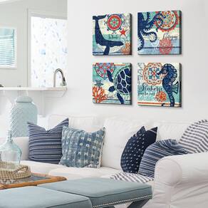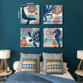 Arte de parede náutica boho decoração de banheiro azul marinho praia temática tartaruga marinha polvo baleia imagens em tela arte costeira vintage oceano náutico animal pôsteres berçário cozinha decoração de casa 4 x 4 peças - Tamanho do produto: 16" x 16" x 4 cm (40 x 40 cm) Cada painel tem 40 x 40 cm – impressões em tela para decoração de parede com pinturas de animais marinhos. - Impressão em tela esticada de arte de animais para decoração de casa, embrulhada em galeria, a imagem é apenas para exibição. O tamanho da imagem exibida na página não representa o tamanho real da tela. Por favor, meça o seu espaço corretamente e escolha o tamanho certo. - Fácil de pendurar: cada painel tem um gancho de metal já montado na barra de madeira. - Arte de parede perfeita para o banheiro, oceano, arte contemporânea em tela para quarto, sala de estar, cozinha, escritório, hotel, sala de jantar, escritório, banheiro, bar, etc. Será uma decoração de parede única para decorar seu espaço. Presentes ideais - Observação: Devido às diferentes marcas de exibição, a pintura real pode diferir ligeiramente da imagem do produto, consulte as cores mostradas na foto. O gráfico de cena exibido à esquerda não é a posição real. O gráfico de cena é uma reprodução da síntese ps do designer, o que é conveniente para o cliente entender claramente o efeito do local.