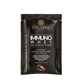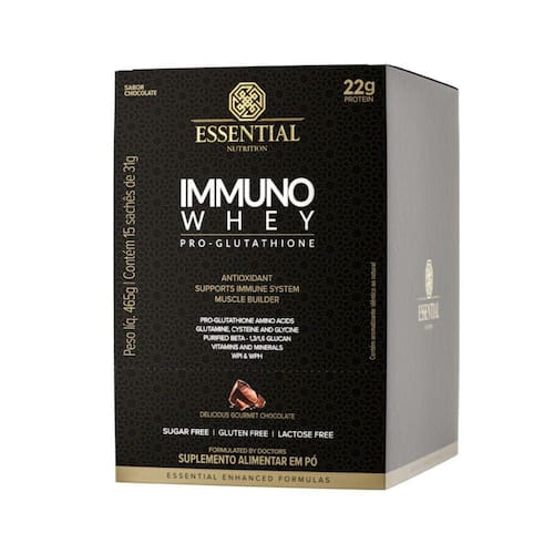Immuno Whey Pro Glutathione Box 15 Sachês 31G NutritionDescrição do produtoO immuno whey pro glutathione da essential nutrition, combina o whey protein isolado e hidrolisado com os aminoácidos - cisteína, glicina e glutamina, além de vitaminas e minerais.Contém adição de taurina, vitamina c e mix de tocoferóis, e a betaglucana de levedura (beta - 1,3/1,6 glucan).BenefíciosWhey protein hidrolisado e isolado;Aminoácidos precursores da produção natural de glutationa (cisteína, glicina e glutamina);Vitaminas e minerais, cofatores na produção natural de glutationa;Taurina;Purified beta - 1,3/1,6 glucan;Puro cacau;Estévia.Caixa com 15 sachêsSugestão de usoAdicione 1 sachê (31g) em aproximadamente 200ml (1 copo) de água e misture até sua total homogeneização. Beba imediatamente após o preparo.Recomenda-se o uso uma vez ao dia ou conforme orientação de médico ou nutricionista.Tabela nutricionalIngredientesProteínas hidrolisada e isolada do soro de leite (thermax®690 e provon®292), cacau alcalino, glicina, glutamina, taurina, cisteína, beta-glucana de levedura, ascorbato de magnésio, mix de tocoferóis, aspartato de magnésio, selenometionina, riboflavina-5-fosfato, aroma idêntico ao natural de chocolate, estabilizante goma xantana, edulcorante estévia.Não contém glúten. Alérgicos: contém derivados de leite e soja (menos de 0,1g de lecitina de soja por porção). Este produto não deve ser consumido por gestantes, lactantes e crianças.Este produto é recomendado para adultos.Este produto não é um medicamento. Não exceder a recomendação diária de consumo indicada na embalagem.Produto isento de registro no M.S. De acordo com o RDC 27/2010.