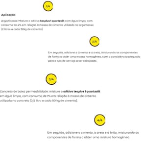 IMPERMEABILIZANTE TECPLUS 18L QUARTZOLITEmbalagem: 18 L tecplus 1 quartzolit é um aditivo líquido impermeabilizante para concreto e argamassa, quando é adicionado à água de amassamento proporciona a redução da permeabilidade para evitar a umidade e infiltração d’água na argamassa.Aumenta a coesão das argamassas, para melhor trabalhabilidade. Pode ser aplicado concretos e argamassas em elementos que estejam expostos à umidade e à pressão da água. Fácil adição a argamassas e concretos Maior garantia e durabilidade da obra Amplo uso na construção civil Isento de cloretos que agridem a armadura da estruturaCor: Branca leitosaValidade: 24 meses (vide marcação na embalagem)Sobre este produtoHomogeneíze o produto na embalagem ou misture tecplus 1 quartzolit com uma haste metálica até obter a completa homogeneização.Evite aplicação da argamassa/concreto sobre superfícies expostas diretamente ao sol ou se houver risco de chuva.Verifique suas ferramentas de trabalho.Use EPIsCaracterísticas e Benefícios* Aditivo para impermeabilização de argamassas de areia e cimento e concretos* Amplo uso na construção civil* Ganho de coesão e trabalhabilidade nas argamassas* Isento de cloretos que agridem a armadura da estruturaContra indicado para* Gesso ou argamassa de gesso. * Misturas onde o aglutinante não seja cimento Portland.* Imagens meramente ilustrativas * Marca: QUARTZOLITCódigo: 78865