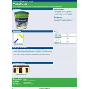 (produto não inflamável) O Viaflex para Parede é um revestimento impermeabilizante acrílico, em especial para infiltrações de água provocadas pelas chuvas em superfícies verticais externas (paredes). Possui tripla característica de desempenho Selador (1º demão ) Impermeabilização (2º demão ) e acabamento (3º demão ). Aplicação sobre: reboco, concreto, fibrocimento e massa acrílica fácil e simples com rolo, trincha ou brocha Protege contra a chuva, evitando infiltração da umidade. Ajuda na redução de calor do ambiente interno, com acabamento na cor branca . Atenção: Manter a embalagem fechada, não reutilizar a embalagem. Armazenar em local coberto, fresco ventilado e longe de fontes de calor. Manter fora do alcance de crianças e animais, manter o ambiente ventilado durante a preparação, aplicação e secagem. Recomendamos usar óculos de segurança, luvas e máscaras protetora. Peso: 3,62 kg Cor: Branco Indicação: Revestimento impermeabilizante acrílico Rendimento: Galão de 3,6 kg 9 a 12 m²/demão Composição: Aspecto líquido viscoso Storner-Krebs a 25ºc 80 a 95 uk e PH a 25ºc 8,8 a 9,5 Validade: Produto válido por 24 meses, a partir da data de fabricação, desde que armazenado em local seco, ventilado e nas embalagens originais e intactas. Número de demãos: 3