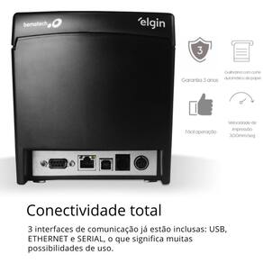 Comunicação: Interfaces de Comunicação: USB + Serial RS232 (DB-9) + Ethernet (Cabos USB e Serial inclusos) 1 | RJ12 female connector for up two drawers (24V, 1A max) Protocolo de comunicação: ESC/POS (Compatível com i9 e i8 Elgin) Códigos de barras: UPC-A / UPC-E / EAN8 / EAN13 / CÓDIGO39 / ITF CÓDIGO 128 / CÓDIGO 93 / PDF417 / QR CODE / INTERCALADO 2/5 *Não suporta ESC/BEMA
