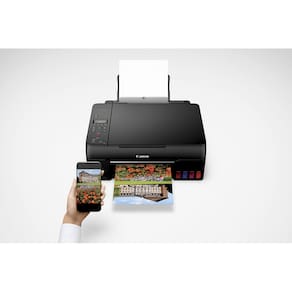 Multifuncional Canon de última geração, a G610 Mega Tank conta com tanque de tinta integrado, garantindo impressões coloridas com incrível resolução e qualidade de cor por um baixo custo de tinta. Com design compacto e moderno, a G610 conta com tela LCD de 2 linhas, facilitando a configuração e utilização do equipamento, sendo altamente recomendado para o uso compartilhado em grupos de trabalho de pequeno e médio porte. O sistema Mega Tank Canon presente na G610 trabalha com tanque de 6 cores individuais, possibilitando impressão de textos nítidos mesmo em fontes pequenas, além de impressões com cores vibrantes. Com impressão de rápida secagem, a multifuncional G610 oferece um volume de impressão maior. A multifuncional Canon Mega Tank G610 possui impressão com resolução máxima de 4800 x 1200 dpi, e é capaz de imprimir uma foto 10x15 em 47 segundos. O tanque frontal permite ver o nível de tinta presente na multifuncional, com sistema de recarga sem desperdício e nem sujeira. Com os tanques cheios, a Canon G610 é capaz de imprimir até 3.800 fotos coloridas 10x15cm. O scanner para tamanho A4/Carta possui resolução ótica de 600 x 1200 dpi, garantindo máxima fidelidade de cor e imagem na digitalização Além disso a conectividade wireless permite a digitalização e impressão sem fio, através de seu notebook, smartphone ou tablet.