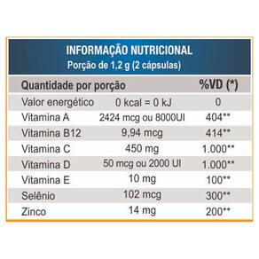 Ácido ascórbico, bisglicinato de zinco, acetato de DL-alfa-tocoferol, selenometionina, acetato de retinol, cianocobalamina, colecalciferol e amido de milho. Cápsula: gelatina vegetal, água e corante clorofilina cúprica.