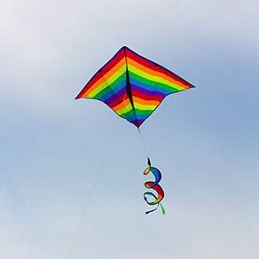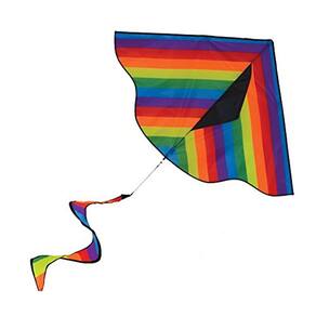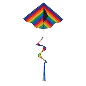 Esta pipa delta exclusiva com listras arco-íris é fácil de pilotar e fica ótima no céu! um girador curlier arco-íris destacável de 42 “flui atrás da parte traseira arredondada do corpo delta. Esta pipa versátil e colorida que toda a família pode desfrutar!