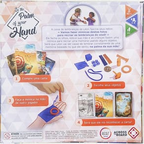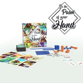 In The Palm Of Your Hand é um jogo criativo que utiliza objetos abstratos para recriar imagens de lembranças variadas vizualizadas em lindas cartas no estilo Dixit. Desafie sua criatividade e tente demonstrar na mão de outro jogador a imagem da sua carta.