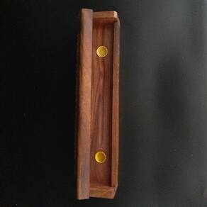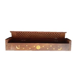 Porta Incenso e incensário de madeira com lindos detalhes talhados na madeira. Seu suporte serve para duas vareta de incenso ao mesmo tempo.Possui um guarda incenso na parte inferior.