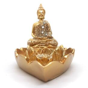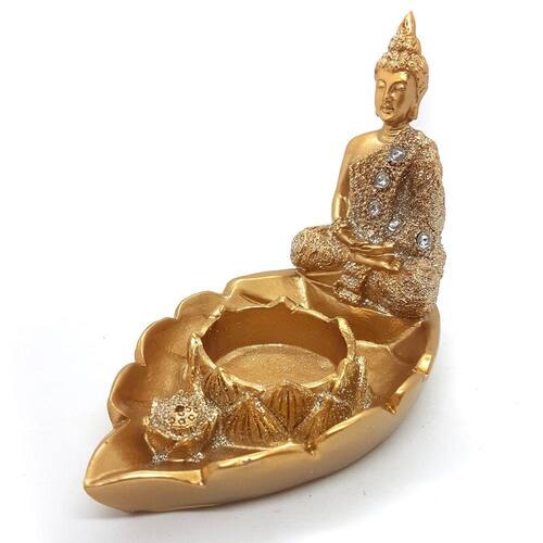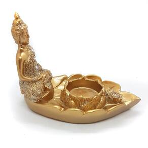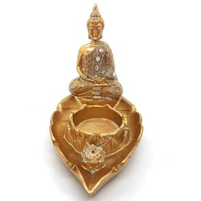 Lindo e delicado incensário e porta velas com buda dourado brilhante meditando. Com pintura dourada intensa. Acrescenta um chame místico à sua decoração e leva proteção ao lar.