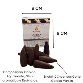 Incenso cascata Goloka Vanilla Back Flow Incenso cascata Goloka Vanilla Back Flow Este incenso da Bialluz, contém uma caixinha com 10 incensos cones Vanilla Back Flow Fabricação em massala - origem: Índia. Caixinha contém 10 cones refluxo Composição: carvão aglutinante, varetas de bambu, óleo aromático de sândalo e essências. Como usar: Mantenha o incensário afastado de correntes de ar ou vento se não a fumaça não irá se movimentar corretamente.Acenda a ponta do incenso goloka até ele ficar avermelhado em brasa e a fumaça sair por baixo do incenso.Após isso coloque o incenso no incensário e ele queimará por até 20 minutos. Enviamos o seu produto em até 24 horas após a confirmação de pagamento Caso tenha alguma dúvida nos mande mensagem que respondemos rapidinho para te ajudar da melhor forma possível Marca: Meta Atacado