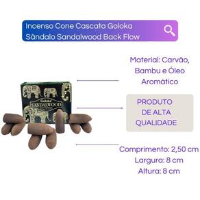 Incenso Cone Cascata Goloka Back Flow - Selecione o Aroma Cor: Sandalwood Back Flow Incenso Cone Cascata Goloka Back Flow - Selecione o Aromax000D Conteúdo da embalagem: uma caixinha com 10 incensos cones tradicional.x000d Fabricação em massala - origem: Índia.x000d x000d Escolha um Aroma disponíveis na opção COR do próprio anúncio.x000d x000d Caixinha contém 10 cones refluxox000D x000d Composição: carvão aglutinante, varetas de bambu, óleo aromático de sândalo e essências.x000d x000d Como usar: x000D Mantenha o incensário afastado de correntes de ar ou vento se não a fumaça não irá se movimentar corretamente.x000d Acenda a ponta do incenso goloka até ele ficar avermelhado em brasa e a fumaça sair por baixo do incenso.x000d Após isso coloque o incenso no incensário e ele queimará por até 20 minutos.x000d x000d Enviamos o seu produto em até 24 horas após a confirmação de pagamentox000D x000d Caso tenha alguma dúvida nos mande mensagem que respondemos rapidinho para te ajudar da melhor forma possível Marca: Bialluz
