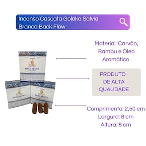 Incenso Cone Cascata Goloka Back Flow - Selecione o Aroma Cor: Sálvia Branca Incenso Cone Cascata Goloka Back Flow - Selecione o Aromax000D Conteúdo da embalagem: uma caixinha com 10 incensos cones tradicional.x000d Fabricação em massala - origem: Índia.x000d x000d Escolha um Aroma disponíveis na opção COR do próprio anúncio.x000d x000d Caixinha contém 10 cones refluxox000D x000d Composição: carvão aglutinante, varetas de bambu, óleo aromático de sândalo e essências.x000d x000d Como usar: x000D Mantenha o incensário afastado de correntes de ar ou vento se não a fumaça não irá se movimentar corretamente.x000d Acenda a ponta do incenso goloka até ele ficar avermelhado em brasa e a fumaça sair por baixo do incenso.x000d Após isso coloque o incenso no incensário e ele queimará por até 20 minutos.x000d x000d Enviamos o seu produto em até 24 horas após a confirmação de pagamentox000D x000d Caso tenha alguma dúvida nos mande mensagem que respondemos rapidinho para te ajudar da melhor forma possível Marca: Bialluz