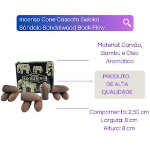 Incenso Cone Cascata Goloka Back Flow - Selecione o Aroma Cor: Sandalwood Back Flow Incenso Cone Cascata Goloka Back Flow - Selecione o Aromax000D Conteúdo da embalagem: uma caixinha com 10 incensos cones tradicional.x000d Fabricação em massala - origem: Índia.x000d x000d Escolha um Aroma disponíveis na opção COR do próprio anúncio.x000d x000d Caixinha contém 10 cones refluxox000D x000d Composição: carvão aglutinante, varetas de bambu, óleo aromático de sândalo e essências.x000d x000d Como usar: x000D Mantenha o incensário afastado de correntes de ar ou vento se não a fumaça não irá se movimentar corretamente.x000d Acenda a ponta do incenso goloka até ele ficar avermelhado em brasa e a fumaça sair por baixo do incenso.x000d Após isso coloque o incenso no incensário e ele queimará por até 20 minutos.x000d x000d Enviamos o seu produto em até 24 horas após a confirmação de pagamentox000D x000d Caso tenha alguma dúvida nos mande mensagem que respondemos rapidinho para te ajudar da melhor forma possível Marca: Bialluz