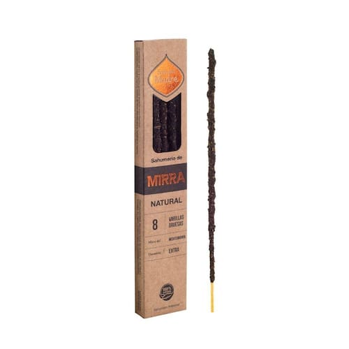 Incenso Natural Mirra Sagrada Madre Incenso natural feito a mão, cada caixa contém 8 varetas.Aroma intenso, amadeirado e rústico. A mirra é usada em ocasiões de purificação, cura e limpeza energética de ambientes e pessoas. Oferece clareza quando há confusão e fortalece o espírito quando há sentimentos negativos.Experimente os outros aromas desta linha:Arruda, Alecrim e OlíbanoCitronela, Laranja e Palo SantoCopalOlíbano PuroSândalo e OlíbanoYagraTempo de queima: aproximadamente 60 minutos cada vareta.Tamanho: 26x4,5x1,5cmA Sagrada Madre utiliza matérias-primas de alta qualidade, sempre com respeito pela natureza e compromisso com a ecologia e sustentabilidade. Marca: Sagrada Madre