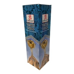 Incenso vence tudo orkay caixa com 8 varetas Harmonize seu ambiente, trazendo paz e harmonia Através dos incensos orkay é possível criar um estado de espírito favorável à introspecção e à espiritualidade com uma atmosfera perfumada que ajuda a manter sua tranquilidade. Os incensos orkay são apreciados por milhares de pessoas. A marca orkay de incensos, diferencia-se dos demais, pela qualidade dos ingredientes neles contidos, garantindo uma boa fixação do aroma no ambiente por horas, mesmo após a queima. Os incensos orkay são feitos de acordo com receitas tradicionais indianas com aromas bem definidos. Possuem fragrâncias únicas com toques diferenciados e é preparado tradicionalmente. As essências utilizadas nos incensos têm funções diversas, atuando diretamente sobre nosso sistema sensorial, trazendo consciência respiratória e uma sensação agradável. Proporciona nosso bem estar, melhora o nosso equilíbrio emocional e cria uma força espiritual muito benéfica. Detalhes técnicos: Produtos novos e selecionados Peso de cada caixa: 16 g Quantidade: 8 varetas produto importado da índia. Tempo de queima aproximadamente de cada vareta 40 min. Medidas de cada embalagem: Comprimento: 26 cm Largura: 1,50 cm Altura: 1,50 cm Composição: Pó de carvão de madeira, resina vegetal, vareta de bambu e fragrância perfume . Modo de uso: -mantenha a vareta acesa sob vigilância, longe de produtos inflamáveis. Evite contato com os olhos e mucosas. - fixe o incenso no incensário e acenda a ponta, espere alguns segundos e apague a chama, deixando-a queimar em brasa. Mantenha os incensos fora do alcance de crianças e animais. Marca: Lua Mística - 100% Original - Loja Oficial Ean: 8906006493568