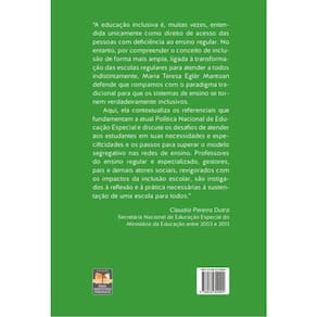 Escrito por uma das maiores especialistas em inclusão escolar no Brasil, esta obra aborda o assunto de maneira clara e didática. Baseando-se na legislação sobre o tema, Maria Teresa Mantoan explica o que é educação inclusiva, discute os passos necessários para implantá-la e ressalta suas vantagens. Livro fundamental para educadores que desejam saltar da teoria para a prática. A coleção: Coordenada por Ulisses F. Araújo, a Coleção Novas Arquiteturas Pedagógicas tem como ponto de partida atender às demandas e necessidades de uma sociedade democrática, multicultural e inclusiva, permeada pelas diferenças e pautada no conhecimento inter, multi e transdisciplinar. Para tanto, publica livros que ajudem os profissionais da educação a construir ambientes educativos inovadores, atentos a formas diferentes de organização dos tempos, espaços e relações na educação. O objetivo é auxiliá-los a incorporar novas linguagens e tecnologias na sua prática docente, bem como aplicar a ética nas relações humanas dentro e fora da escola.