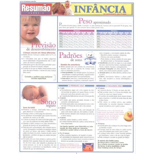 Orientação para acompanhar o desenvolvimento das crianças do nascimento aos 2 anos: previsão de desenvolvimento, peso aproximado, padrões de sono. Desenvolvimento motor. Hábitos alimentares saudáveis. Desenvolvimento perceptivo: olfato, tato e paladar, audição e visão. Desenvolvimento cognitivo: como seu filho aprende. Calendário básico de vacinação da criança. Cuidados com a segurança. Porcentagem de realizações por idade.