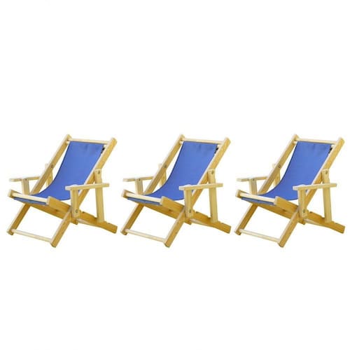 Infantil Kit 3 Cadeira Espreguiçadeira Dobrável-azul 3 ESPREGUIÇADEIRAS C/B INFANTILSabe aquele final de tarde que você tanto espera para tirar um descanso merecido? Ou aquela viagem para a praia programada a meses com a família? Pois é, nossas cadeiras espreguiçadeira serve exatamente para esses momentos, com várias opções de cores, os tecidos além de charmosos são hidro-repelentes e se adequam a qualquer ambiente, facilmente removíveis para higienização.Estrutura 100% de madeira maciça de ótima qualidade, a espreguiçadeira é totalmente dobrável e reclinável (4 posições de ângulo), com descanso para braço, sendo possível montar invertida sem o encosto de braço, perfeita para seu lazer em todos os ambientes, esse é o item que definitivamente não pode faltar na vida de quem de fato, quer aproveitar bons momentos! Medidas Cadeira Espreguiçadeira Infantil:Altura 1: 74,5 cm;Altura 2: 64 cm;Altura 3: 51 cm;Profundidade: 66 cm.Dimensão aproximada total:Comprimento: 64 cm;Largura: 56 cm;03 Níveis de Regulagem de Altura;Tecido Reforçado;Fabricada em Madeira Maciça Pinus;Peso aproximado: 5,5 Kg;Suporta aproximadamente 70 kg;Cor da Madeira: ;Informações Adicionais:Garantia: 90 dias contra defeitos de fabricação.Acompanha 2 cadeiras Obs. A cor pode variar da foto conforme a tonalidade da madeira e iluminação.. !!