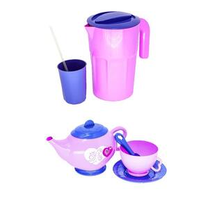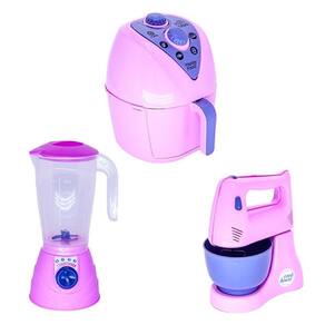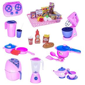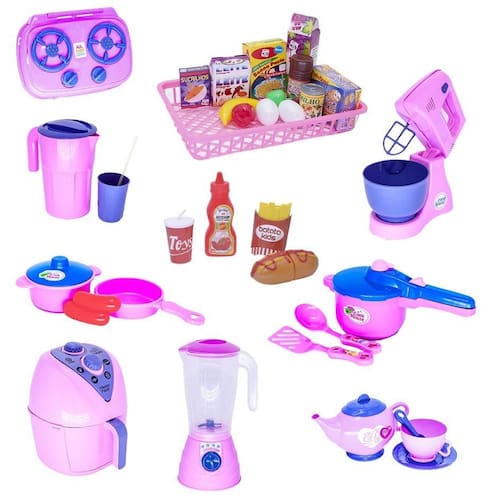 o kit vem com fogão cooktop, louça, jogo de panelas com comidinhas, panelinha de pressão com talheres, batedeira, jarra com canudo, air fryer, liquidificador, xícara com bulê e pires, lanchinho e mercadinho