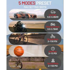 - ? & ?A bomba de ar elétrica tem 5 modos de inflação predefinidos (carros/motocicletas/bicicletas/bolas/manual). A pressão máxima do modo manual é de até 160 PSI e pode ser Trocado de forma simples e fácil Dependendo das suas necessidades de inflação. Modo de carro: 0,0-4,4 bar inflar em 5 minutos/modo de motocicleta: 0,0-3,7 bar inflar em 2 minutos/modo bicicleta: 2~150 psi, inflar em 50s/modo bola 2~15 PSI inflar em 40s.