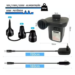 Inflador elétrico de alta velocidade para piscinas infláveis Bomba pneumatica - infla e esvasia - 3 bicos adaptadores - 1 fonte 110-240v - 1 adaptador veicular Perfeito para viagens, acampamentos ou uso domestico Esse modelo de bomba elétrica é ideal para facilitar a sua vida. Para inflar e desinflar boias, botes, balões e colchões com alto volume de ar. Possui alto fluxo de ar e acompanha 3 bicos adaptadores diferentes para os mais diversos tipos de infláveis, enche e esvazia apenas trocando o fluxo de ar. É um aparelho multifuncional que pode ser em uma tomada 100-240v ou encaixado na entrada 12v do carro. Marca: Não Informado