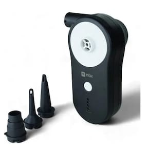 Inflador recarregável USB com vazão de 280 litros por minuto, pressão de 0,58 psi, bateria de 3,7V 4000mAh, tempo de carga de 3 horas e autonomia de 30 minutos. Inclui kit de bicos e cabo USB tipo-C.