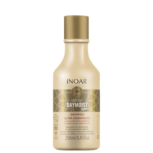 Shampoo para cabelos danificados ou quimicamente tratados. Inoar Absolut DayMoist CLR limpa enquanto repara profundamente os fios.