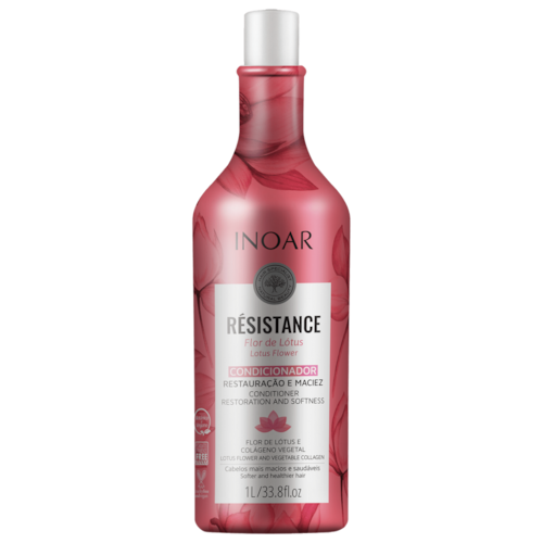 Condicionador Inoar Résistance Flor de Lótus restaura e possui alto poder hidratante, além de facilitar o pentear. Com Flor de Lotus e Colágeno Vegetal, regenera os fios, deixando-os muito mais sedosos e maleáveis. Ideal para quem deseja um cabelo saudável.