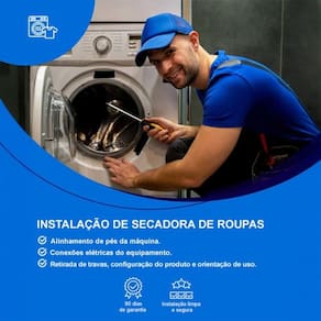 Instalação física de Secadora de Roupas;Verificação das medidas do produto e dimensões do local para correta instalação;Verificação da tensão de alimentação elétrica do produto e da residência;Retirada cuidadosa do equipamento da embalagem, fitas e películas de proteção;Instalação das conexões de entrada, saída, dreno e mangueira.Conexão de fios e cabos do equipamento.Nivelamento de pés e portas (para elegíveis que exijam).Testes de funcionamento, ajustes necessários e configuração.Orientações sobre as travas de segurança e bloqueio de teclado e porta.Orientações para registro do produto no fabricante (site ou telefone).Auxílio e orientações sobre as precauções de segurança e limpeza interna e externa.Orientações para utilização do produto.Limpeza e organização do espaço onde ocorreu a instalação.