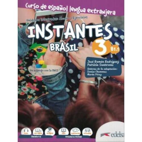 Instantes Brasil - Curso de español lengua extranjera. Unidades integradas: Alumno + Ejercicios + Libro digital (Plataforma = audio + libro digital + ELE digital / Realidad aumentada = Vídeo + Aula invertida + Actividades). De acuerdo con la BNCC.