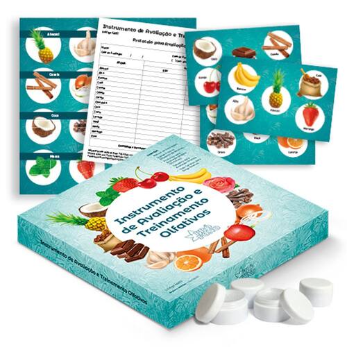 Contém: Frascos difusores com diferentes aromas (15 unidades), Manual de Instruções, Tabuleiro Ilustrado para Avaliação Olfativa, Cartelas para Bingo Olfativo (3 unidades), Protocolo para Avaliação Olfativa (25 cópias e chave de acesso para futuras impressões).
