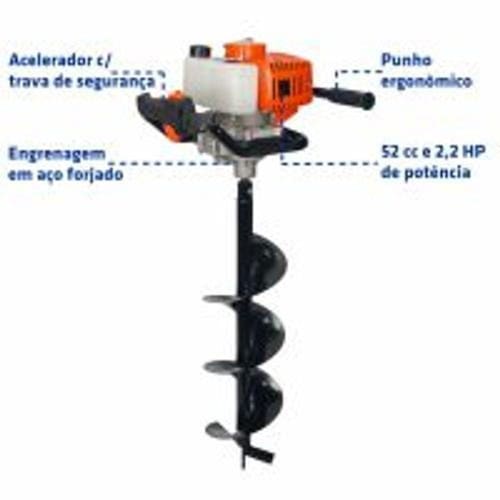 Especificações técnicas: potência 2,2 hp cilindradas 52 cc motor gasolina broca 80 cm x 20 cm tipo do motor 2 tempos refrigeração refrigerado a ar mistura gasolina e óleo mineral 25:1 conector 3/4 partida manual retrátil ignição eletrônica carburador diafragma rotação mínima 2.700-3.300 rpm rotação máxima 8.500-9.000 rpm capacidade do tanque 1,2 l consumo aproximado 1,2 l/h nível de ruído 114 dba peso líquido broca 3,6 kg peso líquido motor 9,34 kg Ean: 7898632335309