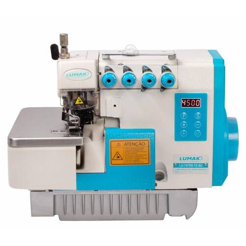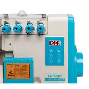 Máquina de costura industrial Interlock LUMAK com motor Direct Drive, 2 agulhas, 5 linhas, alta velocidade, baixo ruído, sistema automático de lubrificação, ajuste de comprimento do ponto e diferencial, protetor de olhos, dedos e correia, design moderno e funcional, passagem de linha identificada por cores, visor do nível e fluxo de óleo, estante com regulagem de altura.Funções