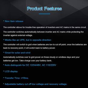 Descrição - ?Benéfico para o sistema solar ou eólico?: Em dias nublados ou sem vento, quando sua bateria fica fraca, ela muda automaticamente para a rede elétrica, protegendo sua bateria. - ?Funciona como um no-break de direção oposta?: O controlador ATS mudará para a energia da rede quando as baterias estiverem mais baixas do que o ponto de corte, voltará à energia da bateria quando as baterias estiverem mais altas do que o ponto de recuperação. - ?Distinção automática?: DC 12/24/48V, AC 100-120V 60HZ / 220-240V 50HZ distinguir automaticamente. O usuário pode definir as tensões de corte e recuperação. A tensão de recuperação deve ser maior do que a tensão de corte. Tipo de bateria: adequado para selado, gel, grafite-ácido, bateria de lítio e assim por diante. desde que a tensão da sua bateria esteja dentro das faixas de tensão a seguir: 9-17V no sistema de 12V; 18-30V no sistema 24V; 30-60V em sistema de 48V. - ?Grande potência?: 5,5 kw (110 V) ou 11 KW (220 v), tempo de transferência rápida: transferência do inversor para potência pública = 10 ms, transferência de energia pública para inversor = 16 ms. - ?Visor LCD?: Tensão em tempo real da bateria; estado de funcionamento de energia pública, inversor e bateria. ?Nota: O controlador precisa conectar a bateria, alimentado pela bateria e obter dados de energia da bateria.