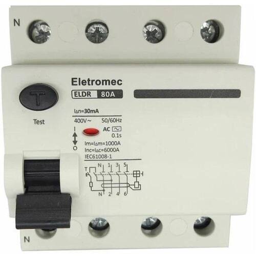Interruptor Diferencial 80A 4P 30Ma 400V EletromecLinha ELDR interruptores diferenciais residuais tem proteção contra fuga, tipo eletromagnético com indicação de falha de fuga, suporte para instalação em trilho DIN 35mm e possibilidade de conexão de cabos de entrada e saída pela parte superior ou inferior.ESPECIFICAÇÕES TÉCNICAS:Produto: Interruptor Tipo: DiferencialModelo: Residual Dr Sensibilidade nominal: 30mA Corrente a : 80ATensao v : 400vPolos: 4 Polos