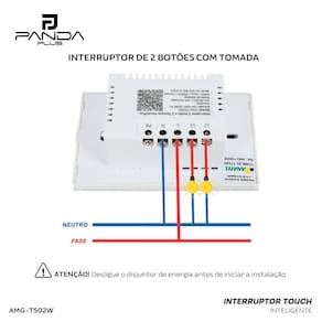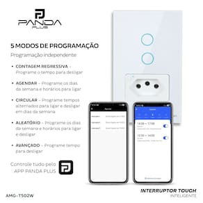 Especificações Técnicas: • Modelo: AMG-TS02 (2 botões com tomada); • Tensão: 110-240V; • Corrente Máxima: 10A (iluminação) / 16A (tomada); • Conectividade: Wi-Fi 2.4GHz ; • Controle via app: PandaPlus, Tuya e Smart Life; • Compatibilidade: iOS, Android, Alexa, Google Assistente; • Uso interno | Não instalar em caixas metálicas; • Dimensões 120x72x43 mm (4x2 PADRÃO); • Material: Vidro temperado e ABS; • Botão físico para ligar/desligar e resetar.