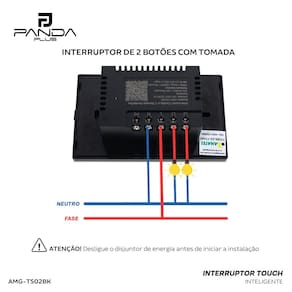 Especificações Técnicas: • Modelo: AMG-TS02 (2 botões com tomada); • Tensão: 110-240V; • Corrente Máxima: 10A (iluminação) / 16A (tomada); • Conectividade: Wi-Fi 2.4GHz ; • Controle via app: PandaPlus, Tuya e Smart Life; • Compatibilidade: iOS, Android, Alexa, Google Assistente; • Uso interno | Não instalar em caixas metálicas; • Dimensões 120x72x43 mm (4x2 PADRÃO); • Material: Vidro temperado e ABS; • Botão físico para ligar/desligar e resetar.