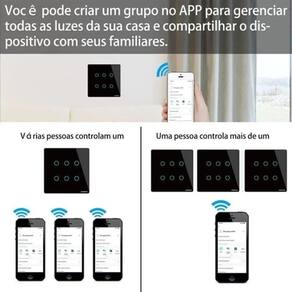 Agendamentos Timer defina horarios para ligar desligar seus dispositivos Memorizacao de status em caso de queda de energia Ligacao em paralelo virtual crie comandos sem a necessidade de fios extras Compartilhamento de controle com outros usuarios Design Moderno e Durabilidade