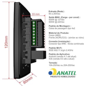 1 Interruptor Smart - PretoComposição do interruptor: 1 Tecla 1 Tomada Características Técnicas do Produto:Material: acrílico espelhado, similar ao vidro e plástico ABSCor: PretoCabe em caixinha 4 x 2Tensão: BivoltConexão Wi-Fi 2.4ghz b/g/n e Bluetooth BLE Bluetooth Low Energy Potência máxima: 500W a 127V ou 800W a 220V Amperagem: 10ACódigo ANATEL: 11605-20-11765OBS: Necessita do fio neutro para a instalação do produto.Características:- Permite controle remoto da iluminação de sua casa- Interruptor compatível com o aplicativo SmartLife, assistente de voz Alexa ou Google Home - Permite programação de temporização, cronômetros, contagens regressivas. - Permite instalação do tipo threeway ou paralelo, com o interruptor convencional que você já possui em casa. Marca: Dometeck