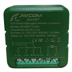Relé Inteligente Wifi 1 Canal JWCOM Medidor Energia Relé Mini Inteligente Wi-fi 1 Canal JWCOM Medidor de Energia A solução completa para automatização residencial, controle inteligente de energia e monitoramento do consumo elétrico Procurando uma maneira inteligente de controlar a iluminação e aparelhos elétricos da sua casa Apresentamos o Relé Mini Inteligente Wi-fi 1 Canal da JWCOM. Com dimensões compactas 42x42x20 mm , esse é a solução perfeita para a automação residencial, permitindo ligar e desligar cargas AC localmente e remotamente. Seu design em ABS branco garante um acabamento moderno e discreto para sua casa. Diferenciais: Compatível com assistentes de voz Google Home e Amazon Alexa Capacidade para 16A e potência máxima de aproximadamente 2200W Controle remoto via aplicativos como JWCOM Smart, Ekaza, Tuya, Smart Life e NovaDigital Funções avançadas como criação de cenas, programação de horários e temporizadores Monitoramento do consumo de energia em tempo real Sensor integrado de temperatura e umidade para monitoramento ambiental Suporta instalação em caixas de interruptores padrão e instalações Three Way Mais sobre o Produto: O Relé Mini Inteligente Wi-fi 1 Canal da JWCOM permite uma série de funções através de seu aplicativo, como controle remoto, programação de horários, temporizadores e monitoramento em tempo real do estado ligado/desligado, incluindo o monitoramento do consumo de energia. Além disso, é possível compartilhar o controle com múltiplos usuários, tornando a experiência ainda mais completa e integrada. Dicas de Uso: Ficha Técnica: Marca: JWCOM Cor: Branco Dimensões: 42 mm x 42 mm x 20 mm Peso: 50g Corrente Máxima: 16A Potência Máxima: Aproximadamente 2200W Wi-fi: IEEE 802.11b/g/n 2,4 GHz Compatibilidade com Assistentes de Voz: Amazon Alexa, Google Home Modo de Conexão: Wi-Fi 2,4 GHz Tensão de Entrada: AC 100-240V 50/60Hz Tensão de Saída: AC 100-240V 50/60Hz : 12 meses contra defeitos de fabricação Marca: Não Informado Ean: 797725705821