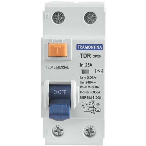 Interruptor Tdr-25 2p 25 A 30 Ma 6 Ka Tramontina Interruptor TDR-25 2P 25 A 30 mA 6 KA Tramontina Para garantir a segurança em seus projetos elétricos, conte com o Interruptor TDR-25 2P 25 A 30 mA 6 KA Tramontina. Desenvolvido para proteger a instalação contra fugas de correntes elétricas de baixa intensidade que um disjuntor comum não consegue detectar, ele é sem dúvida, indispensável para sua casa. É de uso obrigatório para proteção de circuitos residenciais ou comerciais, sejam eles de tomadas ou iluminação, em particular nas instalações de banheiros, cozinhas, áreas de serviço ou áreas externas. Além disso, ele possui indicador de atuação, característica que informa quando houver uma fuga de corrente. Um item essencial para a segurança da sua família, com a qualidade Tramontina que você já conhece e confia!