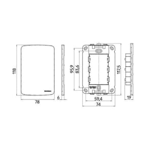 10A e Tomada 2P+T 20A MarGirius B3 com Placa 4x2 Branco Características Gerais do Produto: Dimensões AxLxP mm : Placa: 118x78x6 - Suporte: 117,5x74x19 Quantidade de Teclas: 1 Material: Placa em ABS com aditivo contra raio-uv e Suporte em PA6 30% fibra de vidro Acabamento: Alto Brilho Acompanha Placa: Sim Acompanha Suporte: Sim Polos da Tomada: 2 P + Terra Tamanho: 4x2 Corrente : 10A Acompanha Módulo: Sim Tipo: + Tomada Corrente Tomada: 20A Linha: B3 Quantidade de Módulos: 2 Acompanha o produto: 1 e Tomada 2P+T 20A MarGirius B3 com Placa e Suporte 4x2 : 5 anos junto ao fabricante Marca: Não Informado Ean: 7890428194657